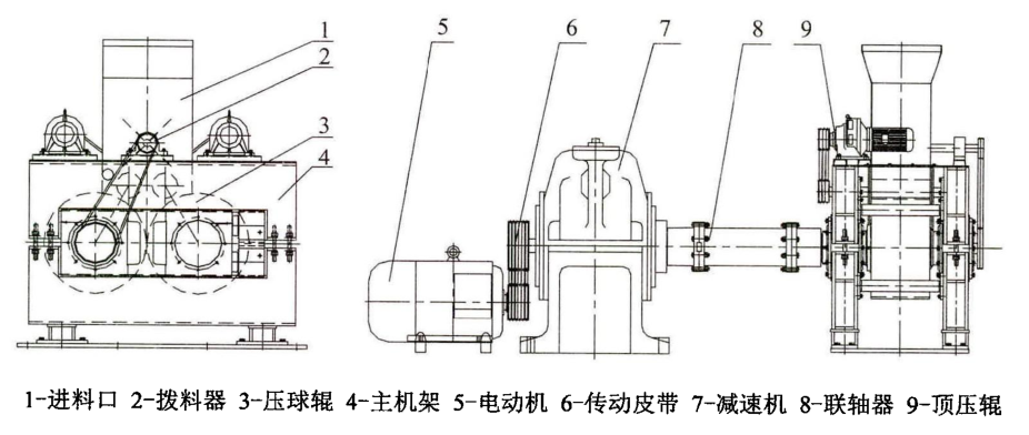 壓球機(jī)是生產(chǎn)線(xiàn)的關(guān)鍵設(shè)備,其主體結(jié)構(gòu)是一對(duì)相向轉(zhuǎn)動(dòng)的壓輥,其中一個(gè)壓輥是固定安裝的,另一個(gè)壓輥為活動(dòng)輥,通過(guò)液壓系統(tǒng)支撐在機(jī)架上,壓輥的表面有定制的模具,當(dāng)物料定量連續(xù)進(jìn)入或通過(guò)預(yù)壓機(jī)強(qiáng)制進(jìn)入壓輥中間時(shí),物料就被壓縮成型。